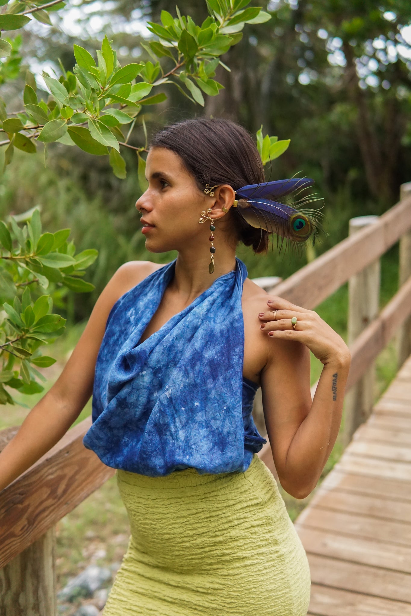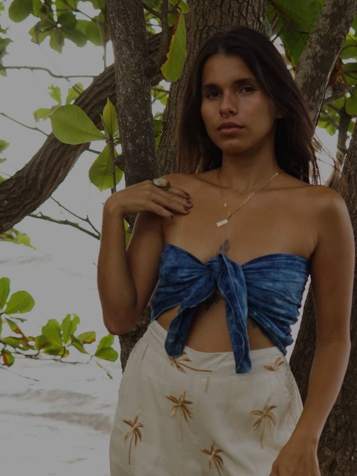 Pieza textil multiuso confeccionada en cotton knit de fibra natural, teñida a mano en índigo con diseños únicos. Creada en colaboración con TDEVÉ x HB Art, cada pieza es especial y hecha con intención.